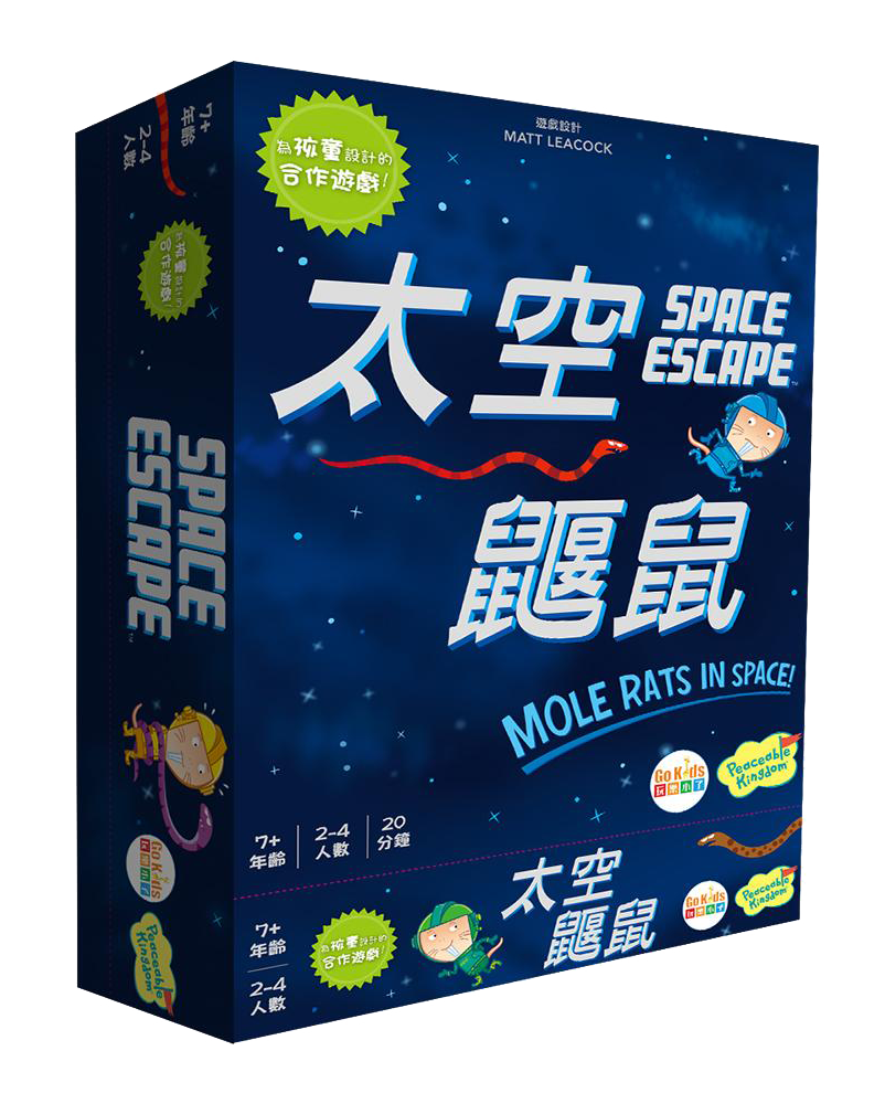 知名設計師 Matt Leacock 設計。 讓孩子們在合作遊戲中自然學習不同的事物,是Peaceable Kingdom的宗旨,太空鼴鼠讓孩子學習思考、合作,輪流,閃避危險等不同概念,一起冒險解決問題,遊戲適合7歲以上,2-4位玩家,時間20分鐘。